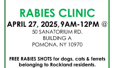 The Rockland County Department of Health announces free rabies vaccinations for cats, dogs, and ferrets belonging to Rockland residents on Sunday, April 27th, 9:00 am – 12:00...