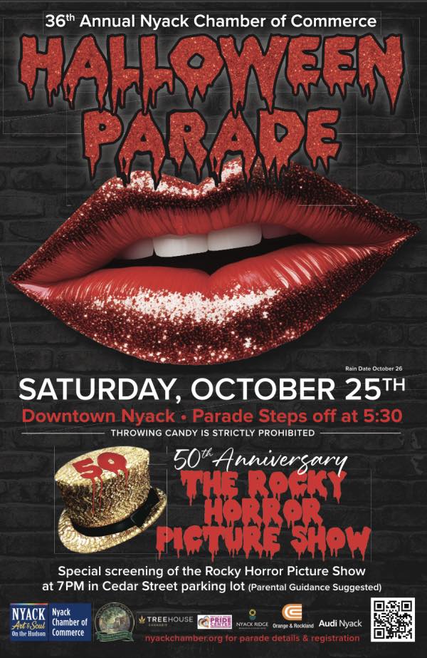 Get ready for the best Halloween event of the year in the heart of Nyack’s historic village. This year’s celebration features a special 50th Anniversary screening of The Rocky Horror Picture Show — a perfect way to end a thrilling day of festivities.