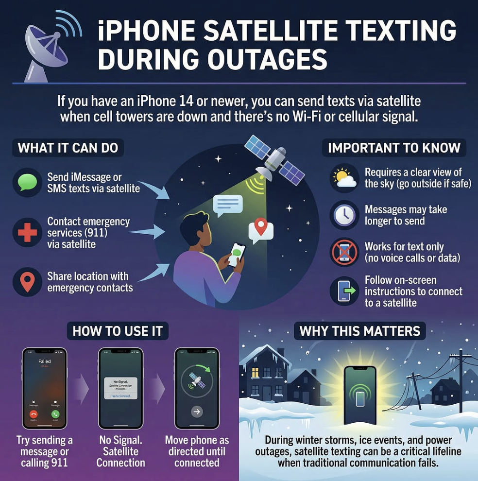 Satellite texting is beginning to support basic two-way messaging with friends and family during outages. These messages are typically text-only and may include location sharing, but do not support photos, videos, or calls.